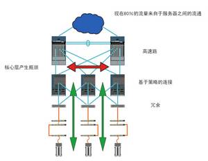 然而,应用趋势(云计算和移动应用程序)使得在数据传输流量发生了改变,由于服务器之间的互动,造成80%的流量现在是来自于服务器之间的流通,在关键的核心层出现了瓶颈(如图所示)。