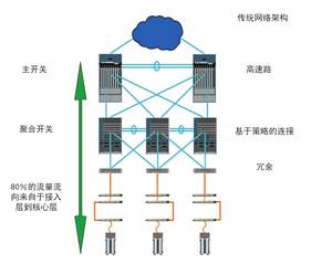 传统的企业网络通常由三个层次组成:服务器连接到接入层,再经汇聚层,最后到基于策略的连接和高速路由核心层。80%的流量流向来自于接入层到核心层,与在网络上只有20%流向是来自于冗余和备份(如图所示)。