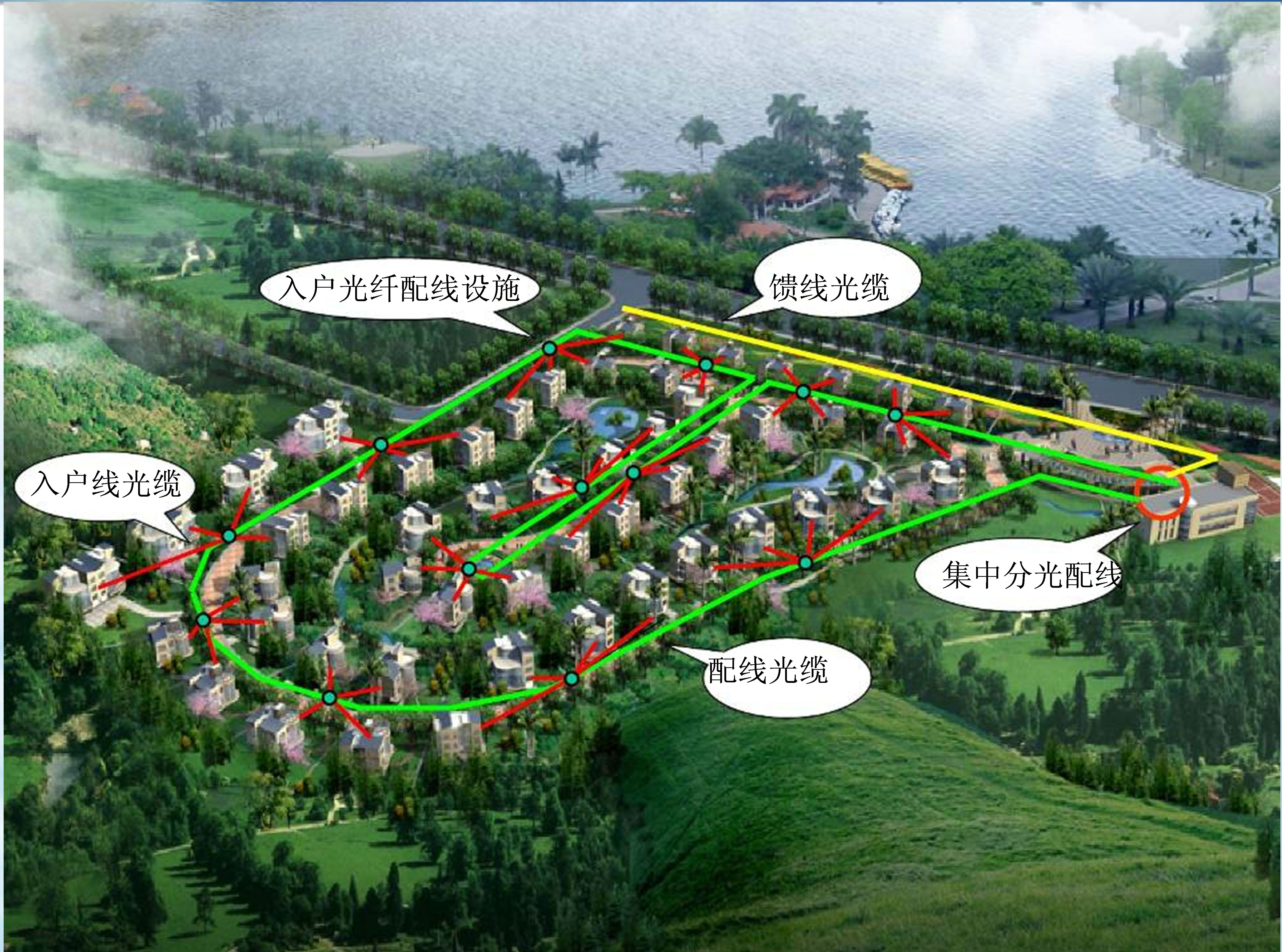 别墅ODN采用小区内光纤交接箱布放配线光缆进行环形布线到入户光纤配线设施模拟图