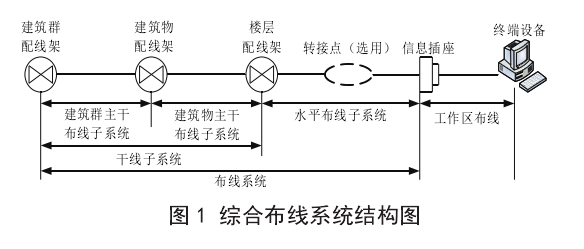 智能建筑综合布线系统(PDS)是一种开放式的系统。它采用模块化结构,以一定的拓扑结构,构成传输大楼话音、数据和图像等信息的网络。综合布线各功能子系统相互连接形成综合布线系统,结构如图 1 所示。按照图 1,PDS 可划分为建筑群主干布线、建筑物主干布线、水平(配线)布线、工作区布线 4 个核心子系统。