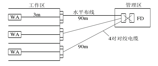 配线间的线缆管理采用六类非屏蔽 48/24 口,配线面板是 RJ45 面板,实际使用高度为 3U/2U。对于用户有高速率终端要求的场合 ( 如计算机房的服务器、贵宾室、研究室等 ) 可采用光纤直接布设到桌面。典型的配线子系统布线和工作区终端设备的连接如图3 所示。