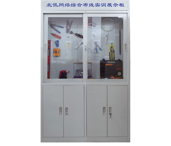 北讯网络综合布线实训展示系列产品能够展示综合布线工程所用到的布线产品、工具、管槽及应用案例等。展示柜为上下部结构,上部展示,下部储物;展示柜钢化玻璃门有防尘功能,可加锁,安全可靠。每个产品和工具均有产品名称和型号标注,方便对布线产品及工具的直观认识。应用案例均有设计规范说明,方便教学展示。