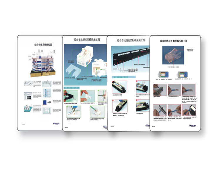北讯综合布线教学示意图将综合布线工程系统结构、产品安装指南、工程管理、线路测试、工程验收等用挂图形式展示,帮助学生直观了解综合布线的理论基础知识和工程基本技能。可展示综合布线的系统连接结构、水晶头端接流程、信息模块端接流程、数据配线架安装流程、光纤熔接流程、双绞线链路主要故障类型等内容。