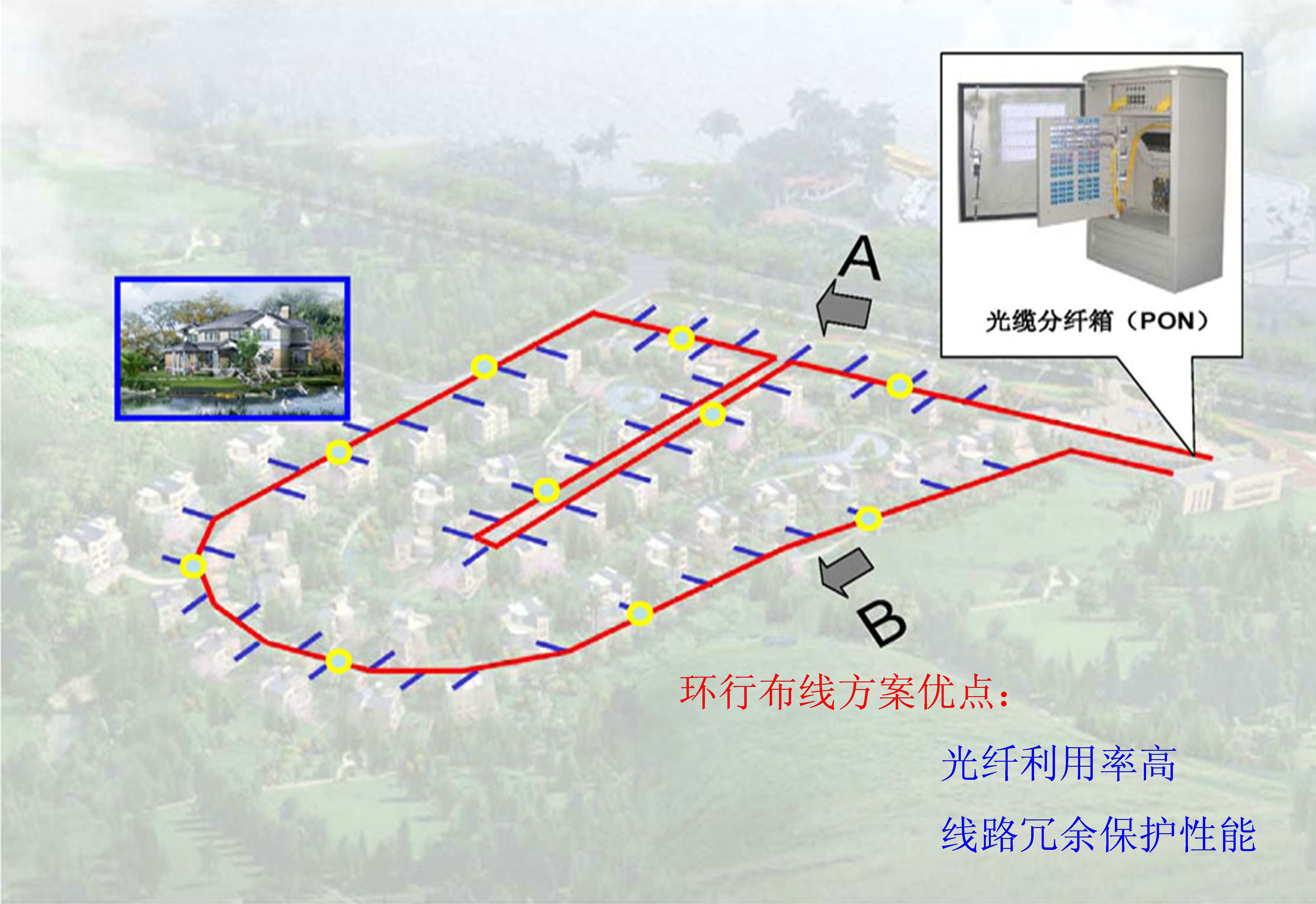 别墅ODN采用小区内光纤交接箱布放配线光缆进行环形布线到入户光纤配线设施模拟图
